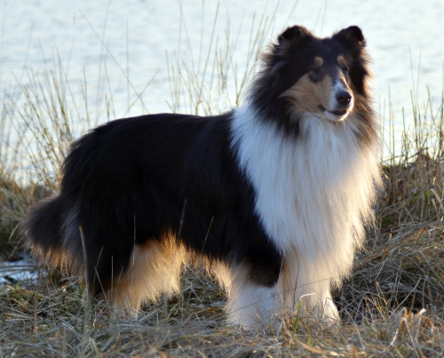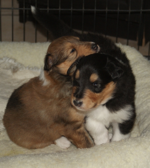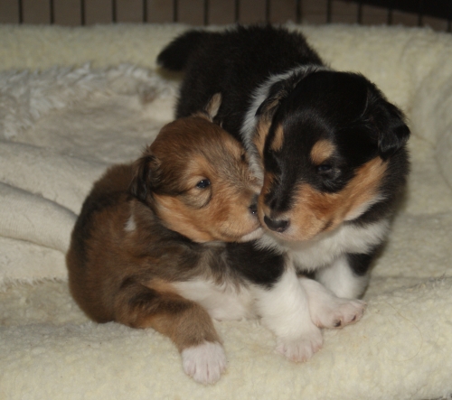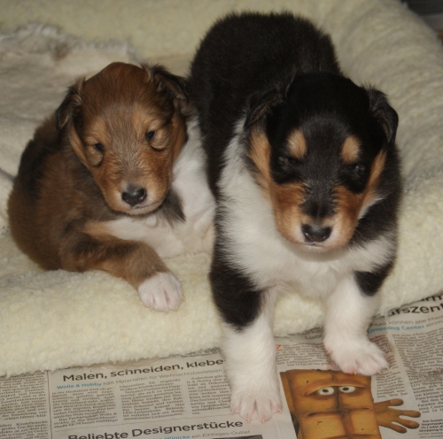 "Winterset Wayne v.O." (tricolour Rüde) und "Winterset Whisper v.O." (sable Hündin)