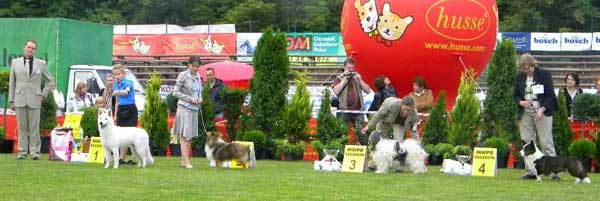 Zum Schluss war dann "Filon's" Schwester "Sassi" in der Zwischenklasse dran, die sich ebenfalls ein "Vorzüglich 1. Platz" und ihr letztes CWC für den POLNISCHEN CHAMPION sicherte ! Wir sind super glücklich, das unser "Impy" damit zwei weitere Championnachkommen vorweisen kann . . .