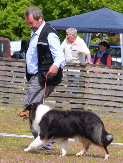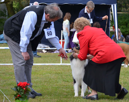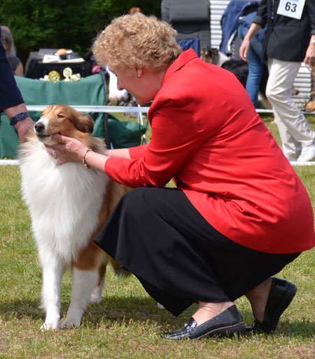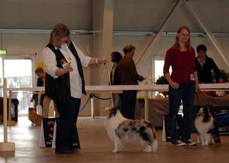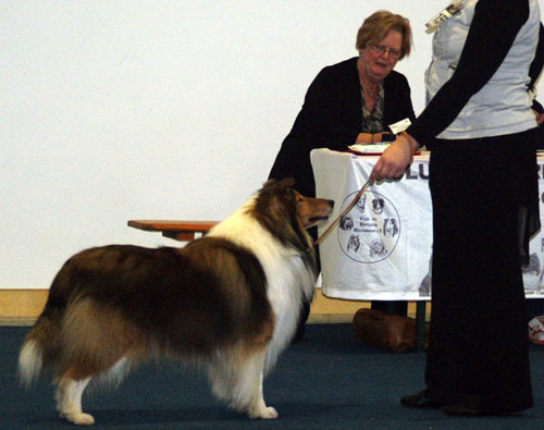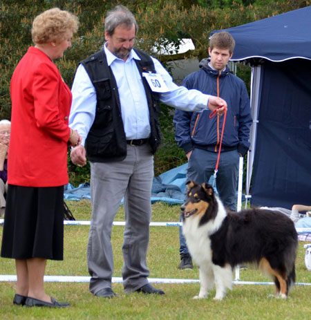 Ein weiteres Highlight an diesem Tage setzte bei den Collies unser Dt. Jgd. Ch. "Halvor Owain of Hope vom Ohmtalteufel", der von Karin in der Offenen Klasse Rüden (10 gem. - 8 anw.) ausgestellt wurde. Er gefiel der Richterin, Mrs. Indergaard aus Norwegen, so gut, dass sie ihn mit einem "Vozüglich 1. Platz CAC/VDH-Ch.A" bewertete. Im übrigen das einzige Vorzüglich in dieser Klasse ! In der Konkurrenz um den Besten Rüden konnte er sodann noch das Res. CACIB gewinnen ! Wir sind unglaublich stolz auf "unseren Halvor" der damit nun schon sein drittes CAC auf einer Internationalen Ausstellung gewinnen konnte.