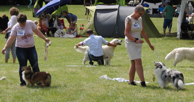 Ein heißes Wochenende liegt hinter uns und dieses mal wurde unsere blaue "Heaven" (= Heavenly blue Halona vom Ohmtalteufel) begleitet von unserer blonden "Penny" (= Dt. Ch., Poln. Ch., Dt. Jgd. Ch. Grandgables Promise of Gold) - somit eine unserer Seniorinnen und unser jüngstes Familienmitglied - denn wir hatten uns daran erinnert wie gerne unsere "Penny" doch immer auf Ausstellungen gewesen war und so wollten wir ihr die Freude machen, sich als Veteranin von fast 10 Jahren noch einem im Ausstellungsring zu präsentieren und was sollen wir sagen, sie machte das einfach so wie zu ihren besten Zeiten.