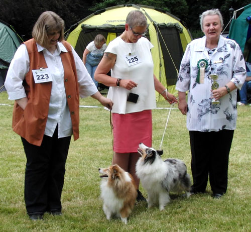 war dann endlich wieder alles so wie gewohnt :-) Nette, Andreas und ich unterwegs mit Shelties und zwar mit "Soccer" (= Molehillsdevils Dark Dressed Man). "Soccer" stammt aus Nette's Zucht, ist im Besitz von Hans-Iver Staugaard, "Shellove" Shelties und zur Zeit auf Deutschlandbesuch um hierzulande die Ausstellungen zu besuchen. Ebenfalls mit dabei unser "Deagi" nach einer längeren Showpause und zum ersten Mal überhaupt unsere "Heaven" (= Heavenly blue Halona vom Ohmtalteufel).