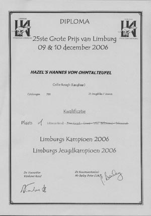 Familie Lange entschloss sich dazu "Hannes", den Wurfbruder unserer kleinen "Hannah" zum ersten mal auszustellen und machte sich am 10. Dezember 2006 auf den Weg zur Internationalen Ausstellung nach Genk in Belgien.