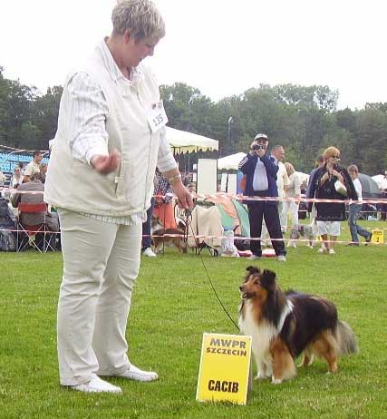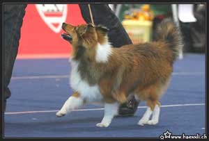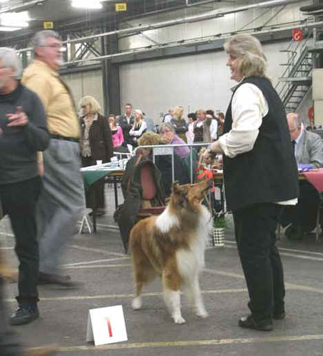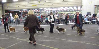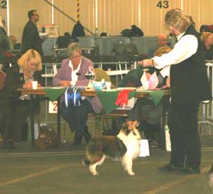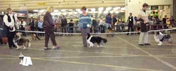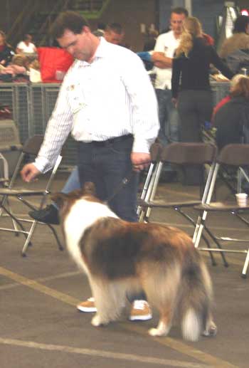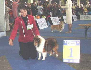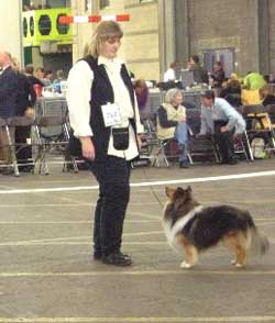 Zuerst waren die Shelties an der Reihe, die von der amerikanischen Richterin Mrs. M. Gladstone gerichtet wurden und hier hatte unser kleiner Impy-Sohn "Filon" (Mozilla Firefox Casidi) seinen ersten Auftritt im Showring. Seine Wurfschwester hatte ja nun schon mehrfach vorgelegt mit Best Puppy usw . . . wie würde nun klein "Filonek" das machen bei seinem "ersten Mal"? Er machte das ganze einfach so super dass ich total begeistert war von ihm. Der Lohn war ein "very promising" und eine wundervolle Beurteilung: "excellent outline, correct head, very good ear set, level top line, well rounded group, moves well coming and going, correct coat, good feet".
