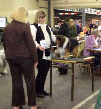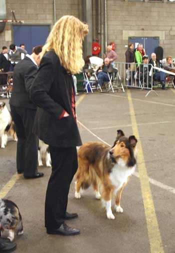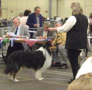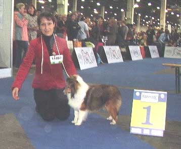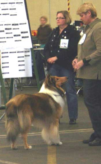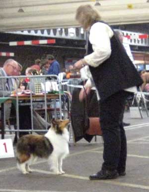 Nun denn, dann kam ich an die Reihe. Ich durfte mal wieder den selbst gezüchteten Sheltiemann meiner Freundin Erika "Gizmo vom Stormarner Land" für sie ausstellen, da sie anderweitig verhindert war. Ach je dachte ich eine Konkurrenz von insges. 8 Rüden in der Offenen Klasse . . . na mal schauen was kommt. Aber zu unserer totalen Freude und der unserer Freunde am Ringrand konnte "Gizmo" die 7 Konkurrenten hinter sich lassen und holte sich das