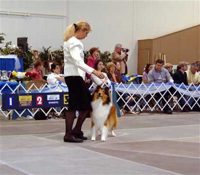 Wir haben lange darüber nachgedacht, ob wir wirklich unsere "Liesi" für einen längeren Zeitraum nach Amerika geben können. Aber da uns Jeff (Laurie Jeff Greer, prof. Handler) immer wieder versicherten wie hübsch sie "Liesi" finde reizte uns eben auch die Frage, wie würde unsere in 4. Generation selbst gezüchtete kleine Collie-Maus "drüben" im Ausstellungsring abschneiden. Also nahmen wir sie kurzerhand in diesem Jahr mit, als wir die CCofA in Oklahoma City besuchten. Alle unsere Freunde und Bekannten dort waren von ihr sehr angetan und da die "Chemie" zwischen ihr und Jeff auf Anhieb stimmte, ließen wir sie in Jeff's Obhut. Mittlerweile haben wir festgestellt, dass Jeff nicht übertrieben hatte, denn "Liesi" konnte schon bei ihren ersten Auftritten (denn erst seit dem letzten April-Wochenende wird sie dort ausgestellt) überzeugen und wir sind unsagbar stolz auf unsere kleine "Liesi-Maus", die folgende Resultate mittlerweile vorweisen kann: (Anm.: bei Offene Klasse handelt es sich in Amerika jeweils um die Offene Klasse sable/white Hündinnen, da hier noch eine Unterteilung in den Farben vorgenommen wird) :