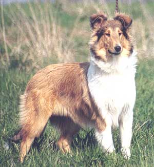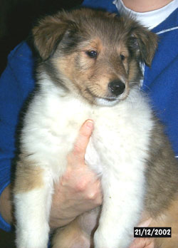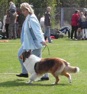 Eine Hündin mit guten Linien, schöner typischer Kopf und gut getragene Ohren, mandelförmige Augen, die ein ganz klein wenig dunkler sein könnten. Gut ausgefüllte Nasenpartie, sehr gute Hals- und Rückenlinie, gute Winkelungen, kräftige Knochen, gute raumgreifende Bewegungen. Gute Fellqualität, aber leider vermisst sie heute zuviel davon."