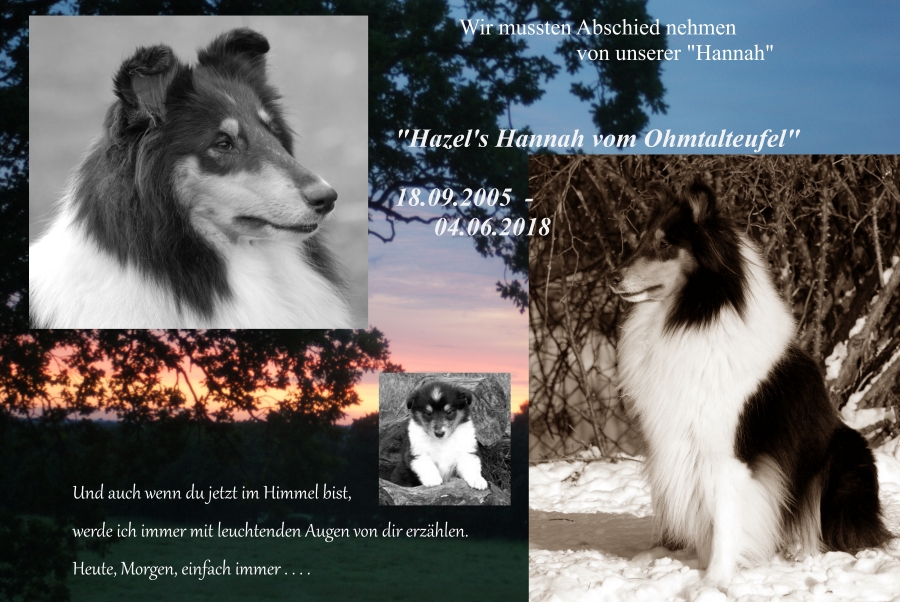 Es gibt aber außerhalb seines Daseins als Deckrüde, so viel mehr und so viele unglaublich schöne Erinnerungen an gemeinsame Momente mit diesem für uns so einzigartigen Sheltiemann, die für uns mehr bedeuten wie all diese Erfolge und die wir ganz fest in unseren Herzen tragen . . . und wenn wir uns daran erinnern, ist es als ob er wieder bei uns ist. Wir sind glücklich das wir durch seine Kinder "Chelsey", "Therese" (Int. & Dt. Ch., Crufts-qualifiziert) und "Filon" (Dt., Poln., Dän. u. Litt. Ch., Crufts qualifizier) und seine Enkelkinder "Chaya", "Zoji" (Dt. & Poln. Ch.) und "Deagi" (Dt. Jgd. Ch.) und seine Urenkeltochter "Abigail" immer ein kleines Stück von ihm hier bei uns haben werden . . .