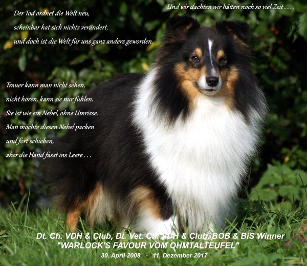 ![]() Warum??? Warum lieber Gott holst du die besten immer viel zu früh und unerwartet zu Dir???? Warum gerade unser Favi, unser Sonnenschein unser Grinsekeks unser immer und allseits fröhlicher und jedem zugewandter kleiner Schelm, den wir so sehr lieben . . . . ??? Wir sind so unglaublich traurig, das wir kaum Worte finden, denn dieser heimtückische bösartige Tumor riss ihn von jetzt auf gleich aus unseren Armen, aus unserem Leben . . . Wir hatten keine Chance, er hatte keine Chance . . . Die, die unseren Favour persönlich kennen lernen durften, wissen wie er war und wie er sich auf seine eigene liebenswerte Art in die Herzen der Menschen geschlichen hat. Wer ihn einmal erlebt hat, der verliebte sich spontan <3 Dieser kleine immer fröhliche Schlingel, dem meine Schwester den Namen „Pfeiffer mit 3 f“ verpasste und dabei vielleicht noch nicht einmal ahnte wie sehr dieser Name ins Schwarze traf bei unserem „Favi“ der schon sehr früh unsere Herzen eroberte und wir dem Schicksal so dankbar sind dass wir ihn hier bei uns haben durften und glücklich auch über seine zahlreichen Nachwuchs der ihn als Vater nicht verleugnen kann . . . Wir hatten noch so viele Pläne für die nächsten Jahre waren in unserem Kopf, aber es sollte nicht sein . . . Wir sind so stolz auf diesen kleinen Sheltiemann, der ein so großes Herz hatte und mit so viel Vertrauen und Liebe zu Menschen und einem großen Selbstbewusstsein ausgestattet war. Unser kleiner „Pfeiffer“ oder oft auch liebevoll „Pöppelmann“ genannt - Insider wissen was damit gemeint ist – hat uns so oft zum Lachen gebracht mit seiner ihm eigenen Art u.a. „einkaufen zu gehen“ oder „die Shetiemädchen zu beglücken“, oder uns lächelnd auf den Ausstellungen zu begleiten, wo er und wir mit ihm so viel Spaß hatten und und und, und jetzt, jetzt wollen unsere Tränen nicht versiegen. Mein „Favi“