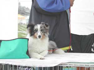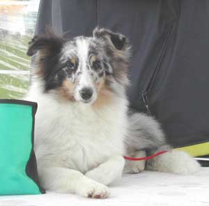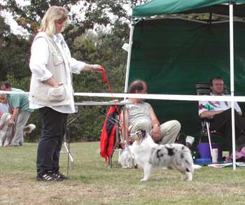 "merle, lovely coat and markings, lovely shape and outline, good coat for age, good bone and well setdown hocks, moved well, nice one piece head, well placed eye, showed well." EXCELLENT 1. |