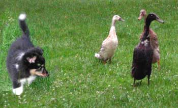 Die Fotos zeigen "Zera" im zarten Alter von 8 Wochen beim ersten Hütetraining mit unseren Laufenten . . . :-)) |