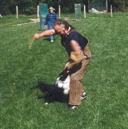 "Bunny" beim Übungsteil "Überfall mit anschließender Flucht des Helfers". Mittlerweile trägt der Helfer seine gewohnte Schutzhose und auch den "normalen" Schutzarm. |