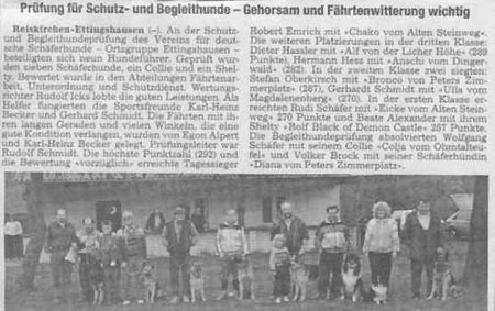 Foto und Zeitungsartikel nach erfolgreich bestandener SchH 1 - Prüfung. Der Collie links von "Bunny" ist übrigens "Colja vom Ohmtalteufel", der an diesem Tage zum 3. Mal die BH-Prüfung bestanden hatte.