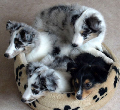 | "Favour's" einundzwanzigster Wurf geb. am 20.12.2015 war mit unserer "Dt. Jgd. Ch. Heavenley blue Halona vom Ohmtalteufel" und zwar 1 Rüde blue merle, 1 Rüde tricolour, 1 Hündin tricolour | "Favour's" zweiundzwanzigster Wurf geb. am 15.05.2017 war mit unserer "Kea keep it up vom Ohmtalteufel" und zwar 2 Rüden sable und 2 Hündinnen sable |